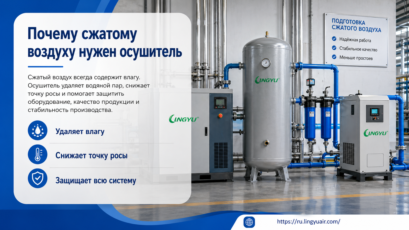 Влага — главный враг пневмосистемы. Она появляется неизбежно: воздух из окружающей среды содержит водяной пар, а при сжатии его концентрация растёт. После компрессора горячий воздух