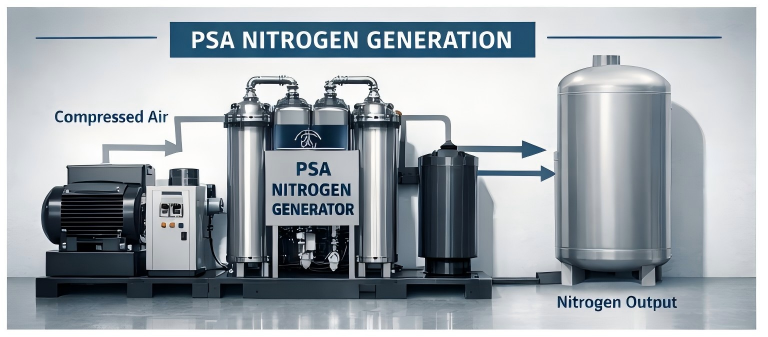 Генераторы PSA используют углеродные молекулярные сита для селективной адсорбции молекул кислорода из сжатого воздуха, позволяя азоту проходить в качестве конечного продукта. Эта технология позволяет получать азот очень высокой чистоты — до 99,999%.