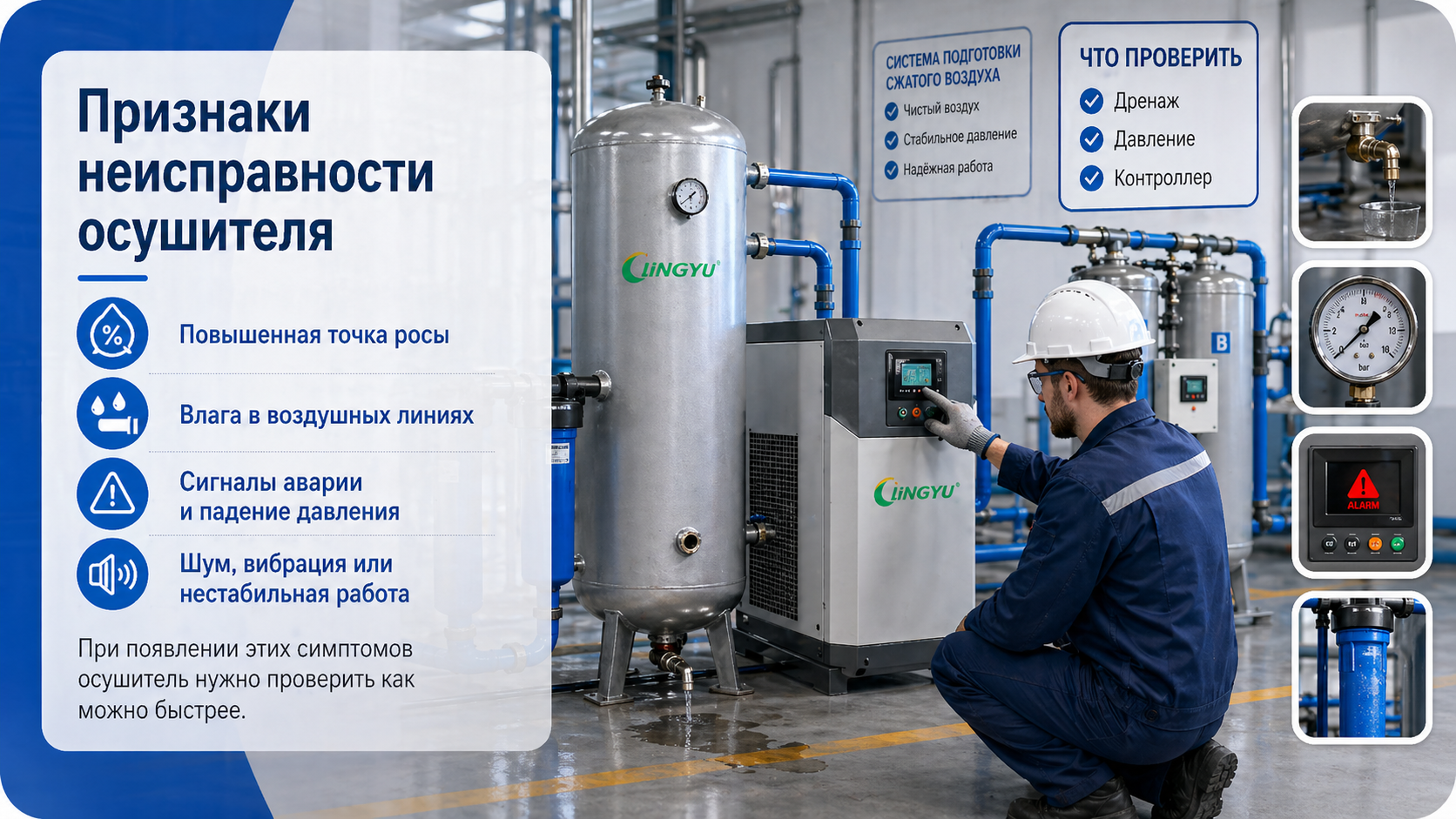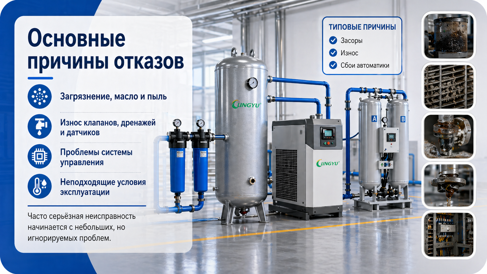На большинстве производств осушитель выходит из строя не из-за одной крупной аварии, а из-за накопления мелких проблем, которые долго оставались без внимания.