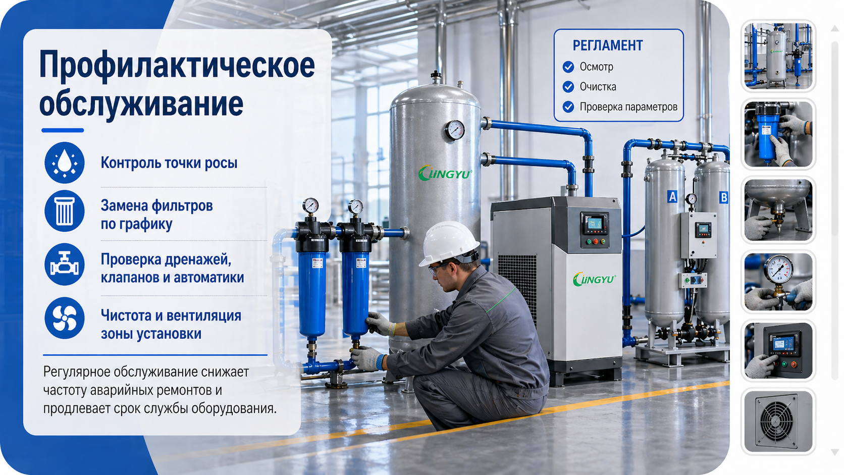 Лучший способ сократить количество аварийных ремонтов — это регулярное техническое обслуживание. Осушитель, который обслуживается по графику, работает эффективнее и реже выходит из строя неожиданно.
