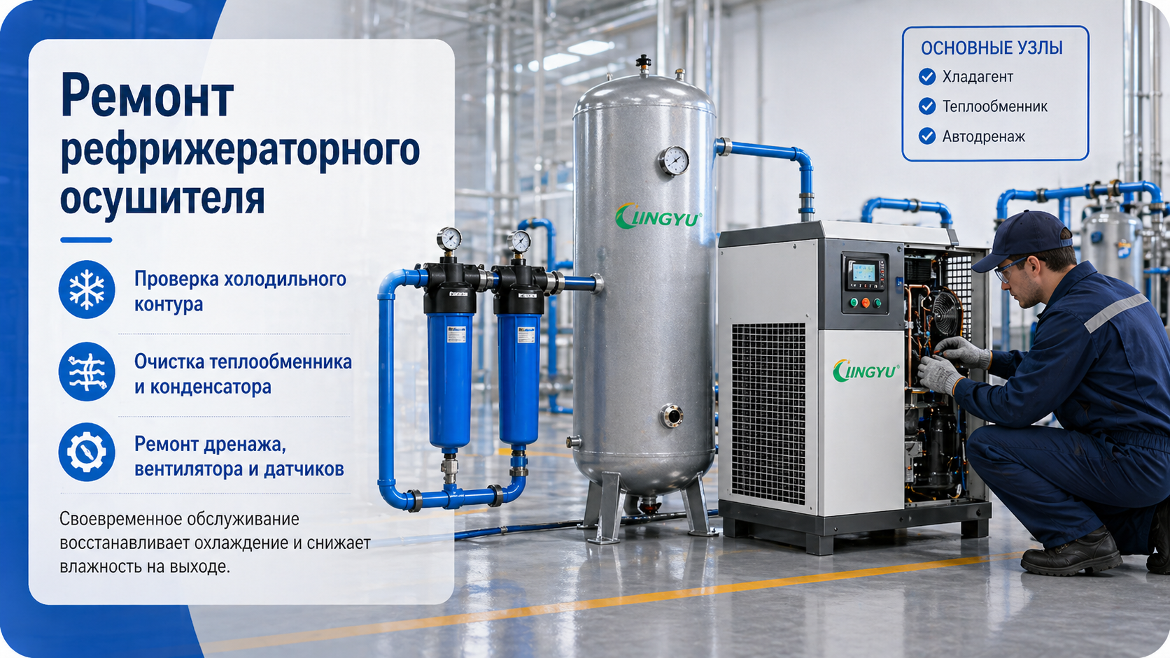 Именно поэтому своевременный ремонт осушителя защищает гораздо больше, чем сам осушитель. Он помогает предотвратить коррозию в последующих участках, загрязнение продукции, проблемы с автоматикой и перебои в работе всего предприятия.
