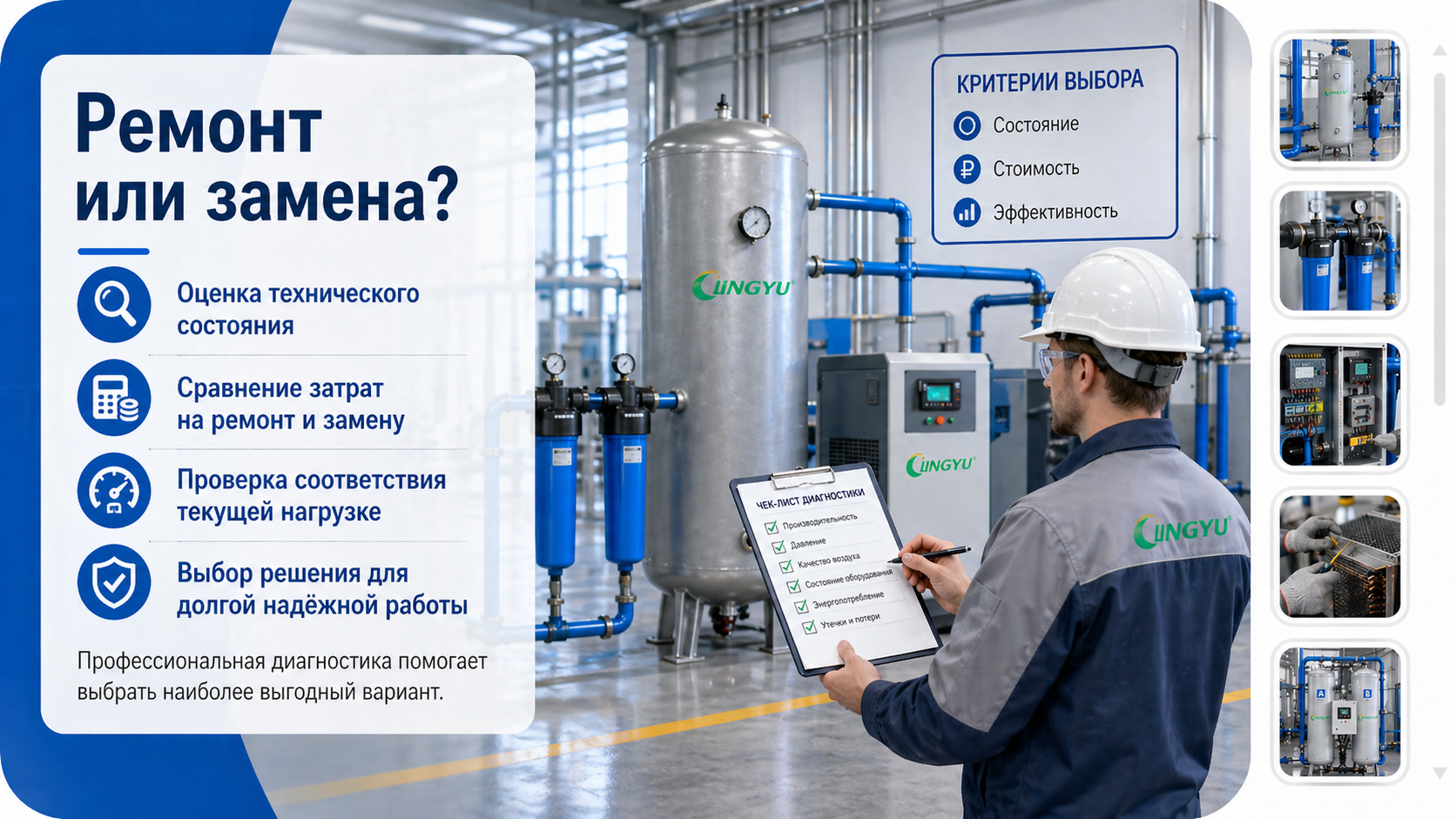 Промышленным предприятиям важно внимательно подходить к выбору подрядчика по ремонту. Надёжная сервисная команда должна разбираться в системах сжатого воздуха, типах осушителей, элементах автоматики и реальных условиях эксплуатации на производстве.