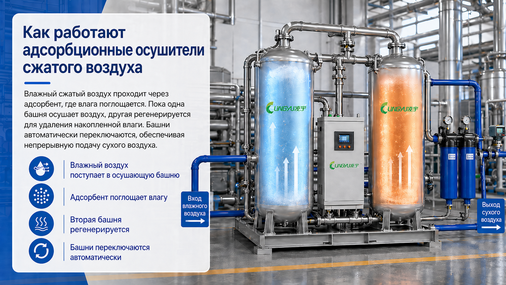 Адсорбционный осушитель работает не за счёт охлаждения, а за счёт адсорбции влаги. В этом случае сжатый воздух проходит через колонну с осушающим материалом — например, активированным оксидом алюминия, силикагелем или молекулярным ситом. Адсорбент удерживает влагу на своей поверхности, благодаря чему на выходе получается воздух с гораздо более низкой точкой росы, чем у рефрижераторного осушителя.