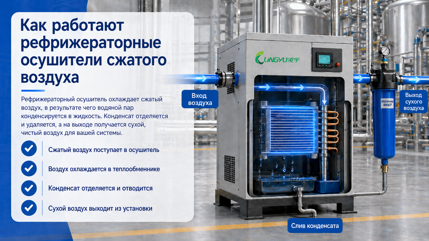 Рефрижераторный осушитель работает за счёт охлаждения сжатого воздуха до температуры, при которой водяной пар конденсируется в жидкость и может быть отведён из системы. По данным производителей компрессорного оборудования и отраслевых справочников, такие осушители обычно обеспечивают точку росы порядка 33–39°F или около 2–4°C, что подходит для большинства стандартных промышленных задач.