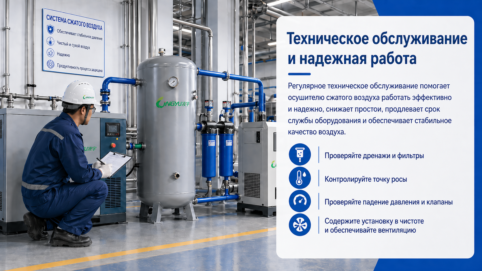 В российских условиях обслуживание особенно важно в переходные сезоны и зимой, когда риск конденсации и замерзания повышается. Регулярный сервис помогает избежать неожиданных остановок, сохранить стабильную осушку и продлить срок службы оборудования.