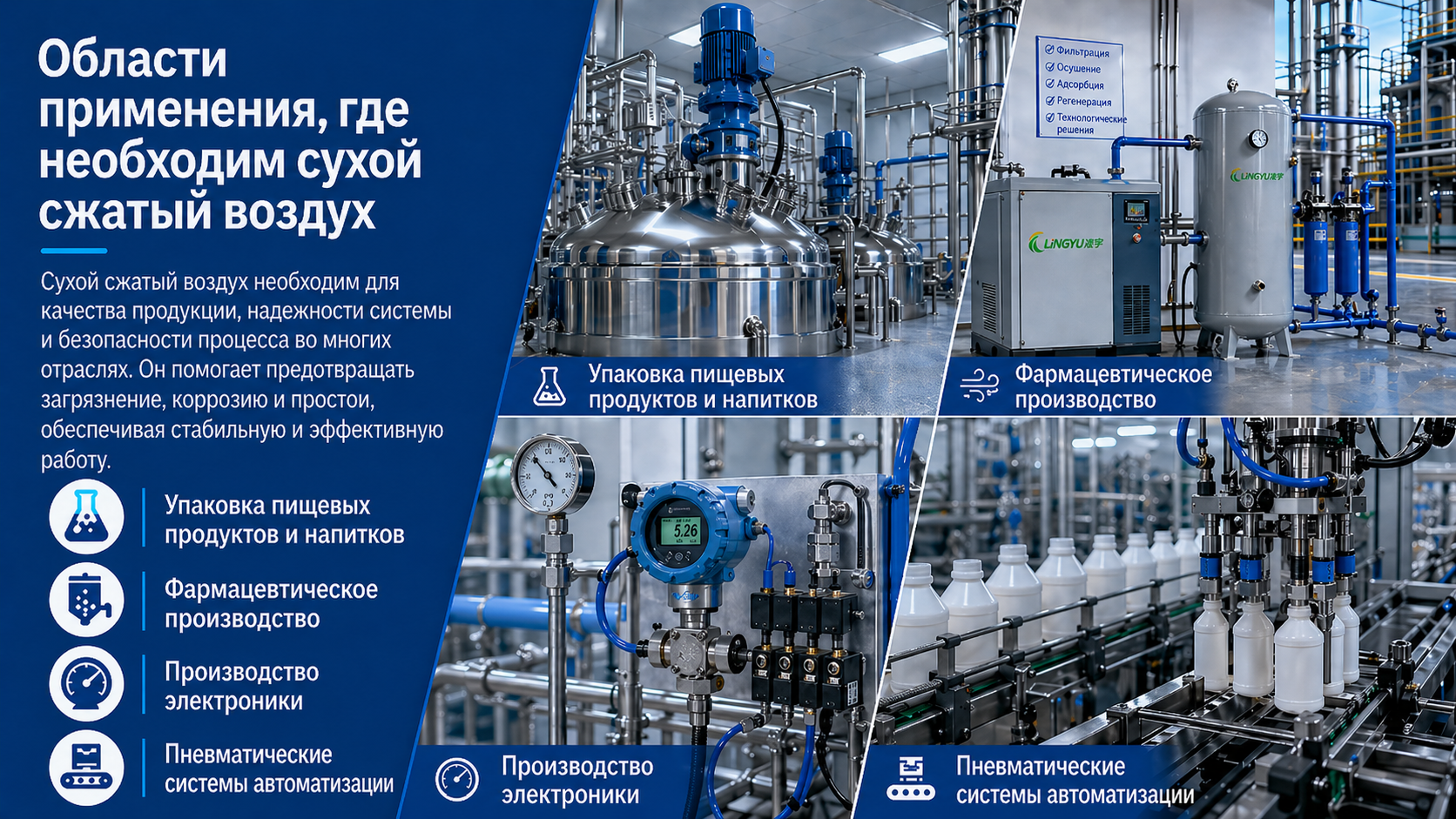 Это особенно актуально для отраслей, которые сейчас наиболее заметны в российской промышленности: нефтегаз и газопереработка, химический комплекс и минеральные удобрения, пищевая переработка, фармацевтика, радиоэлектроника, а также автоматизированные производства с большим количеством пневматических контуров. В этих секторах влажность воздуха нередко означает не просто техническую проблему, а риск остановки линии, брака или нарушения стабильности процесса.
