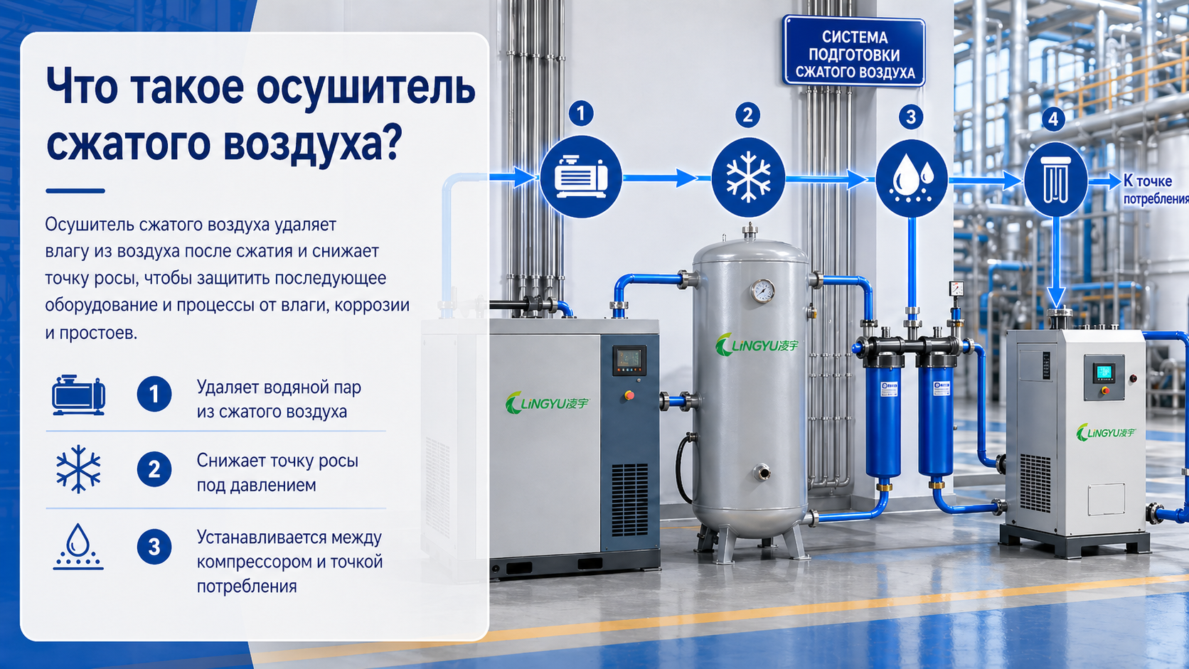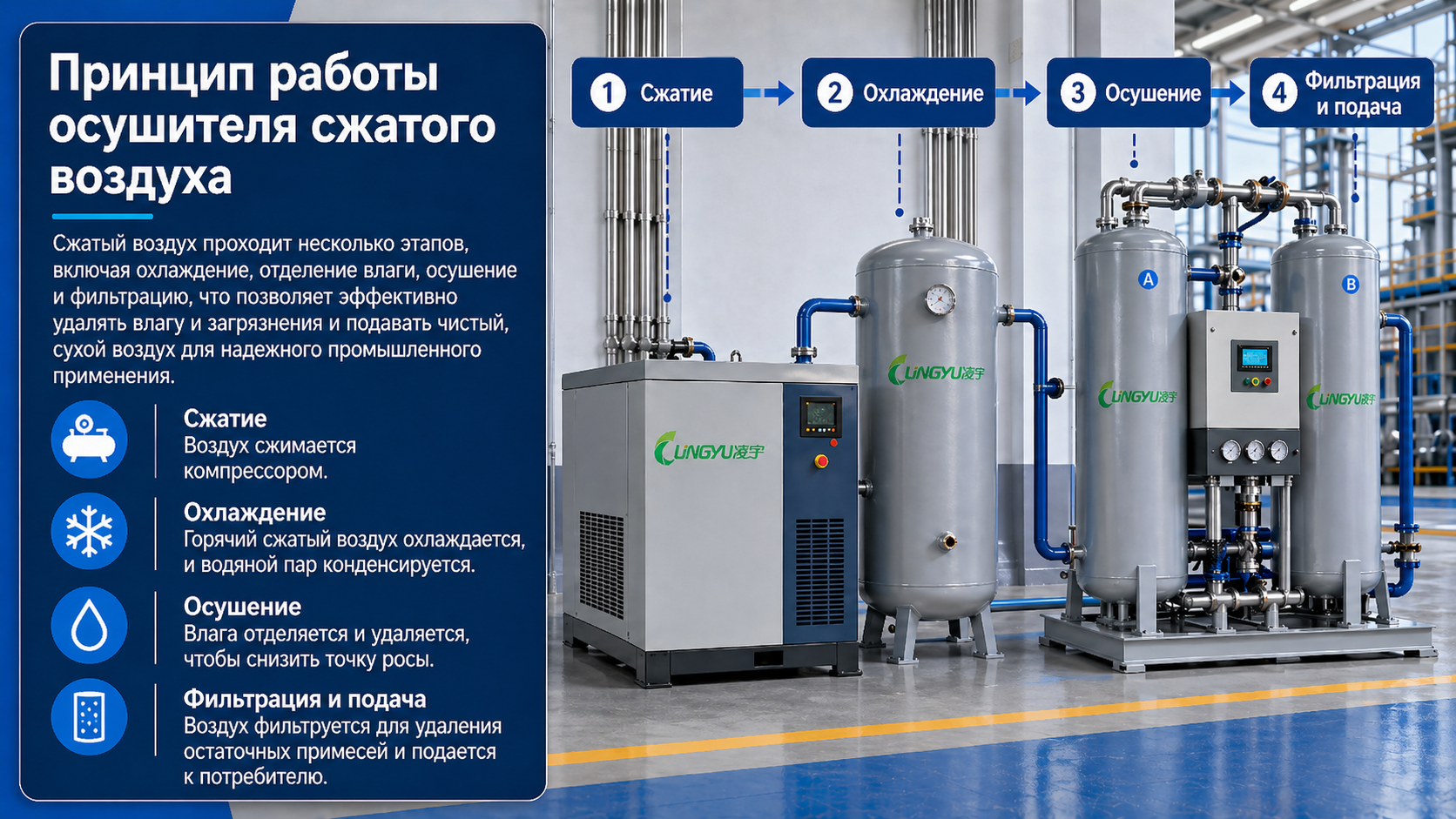 Сжатый воздух остаётся одним из самых востребованных энергоносителей в современной промышленности. Он приводит в действие пневмоинструмент, поддерживает автоматизированные линии, управляет клапанами и приборами, а также обеспечивает стабильную работу множества технологических процессов. Для российских предприятий эта тема особенно важна: в стране остаются значимыми нефтегазовый сектор, химический комплекс, переработка сырья, пищевая промышленность, фармацевтика и радиоэлектроника, а в ряде регионов оборудование дополнительно работает в условиях низких температур и резких сезонных перепадов. Именно поэтому понимание принципа работы осушителя сжатого воздуха особенно важно для промышленных пользователей в России.