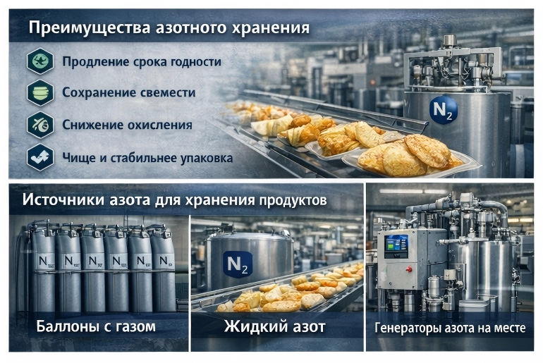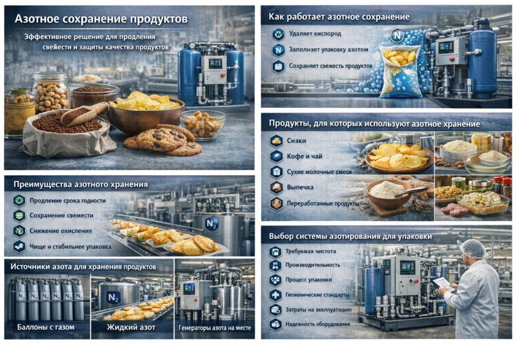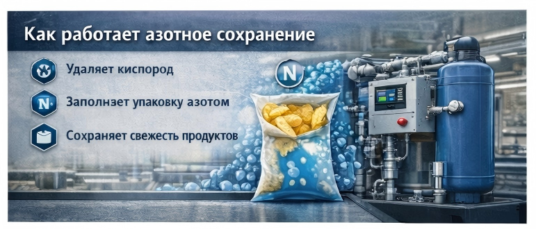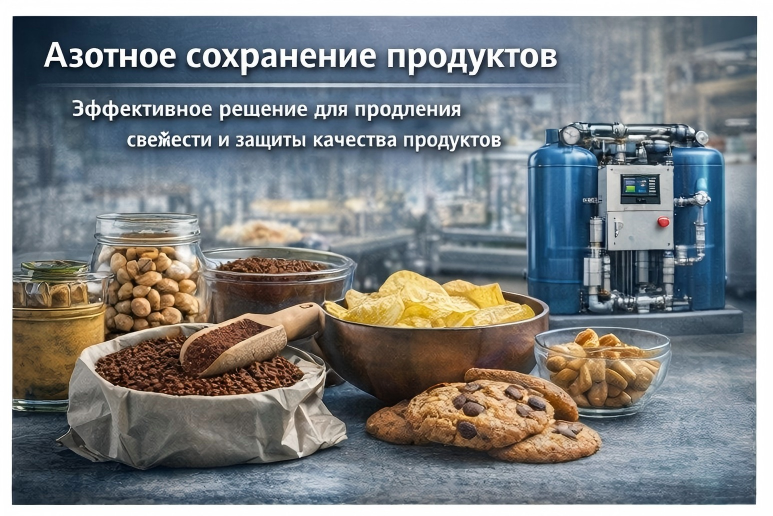 Азот является сухим и инертным газом, что делает его подходящим для пищевых производств, где требуются чистые и контролируемые условия упаковки.