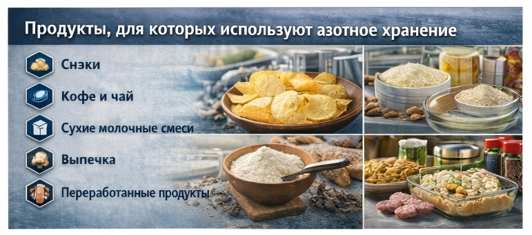 Упакованные сухие продукты, злаки, приправы и готовые к употреблению продукты также могут использовать азот как часть стратегии сохранения качества.