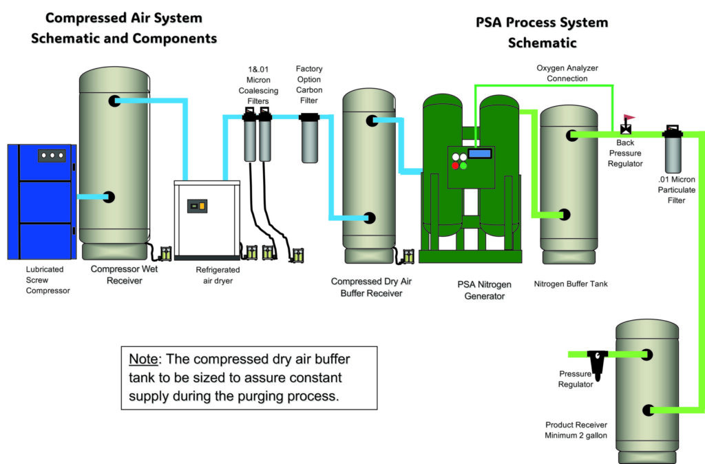 PSA-генераторы отделяют азот от воздуха за счет адсорбции кислорода и других газов под высоким давлением. Они широко используются благодаря надежности и легкости интеграции в системы танкеров.