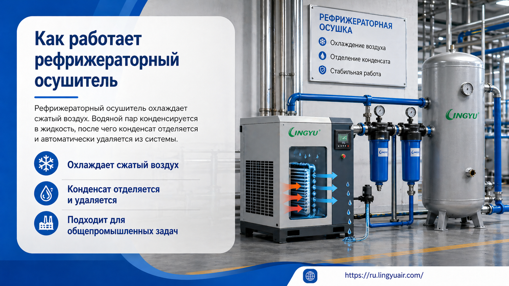 Рефрижераторный осушитель работает за счёт охлаждения сжатого воздуха до низкой температуры, при которой водяной пар конденсируется в жидкость. Затем этот конденсат отделяется и удаляется из системы. В результате получается сухой воздух с умеренной точкой росы, который подходит для большинства стандартных промышленных задач.