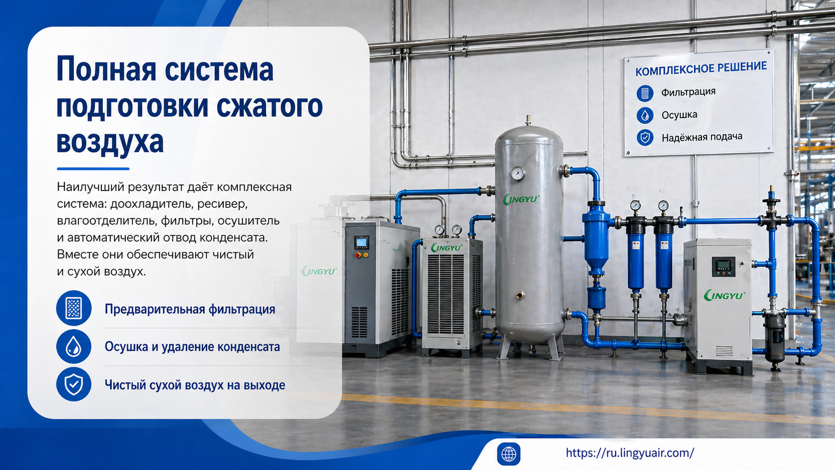 Когда все эти компоненты работают вместе, система способна обеспечивать более чистый, более сухой и более надёжный сжатый воздух.