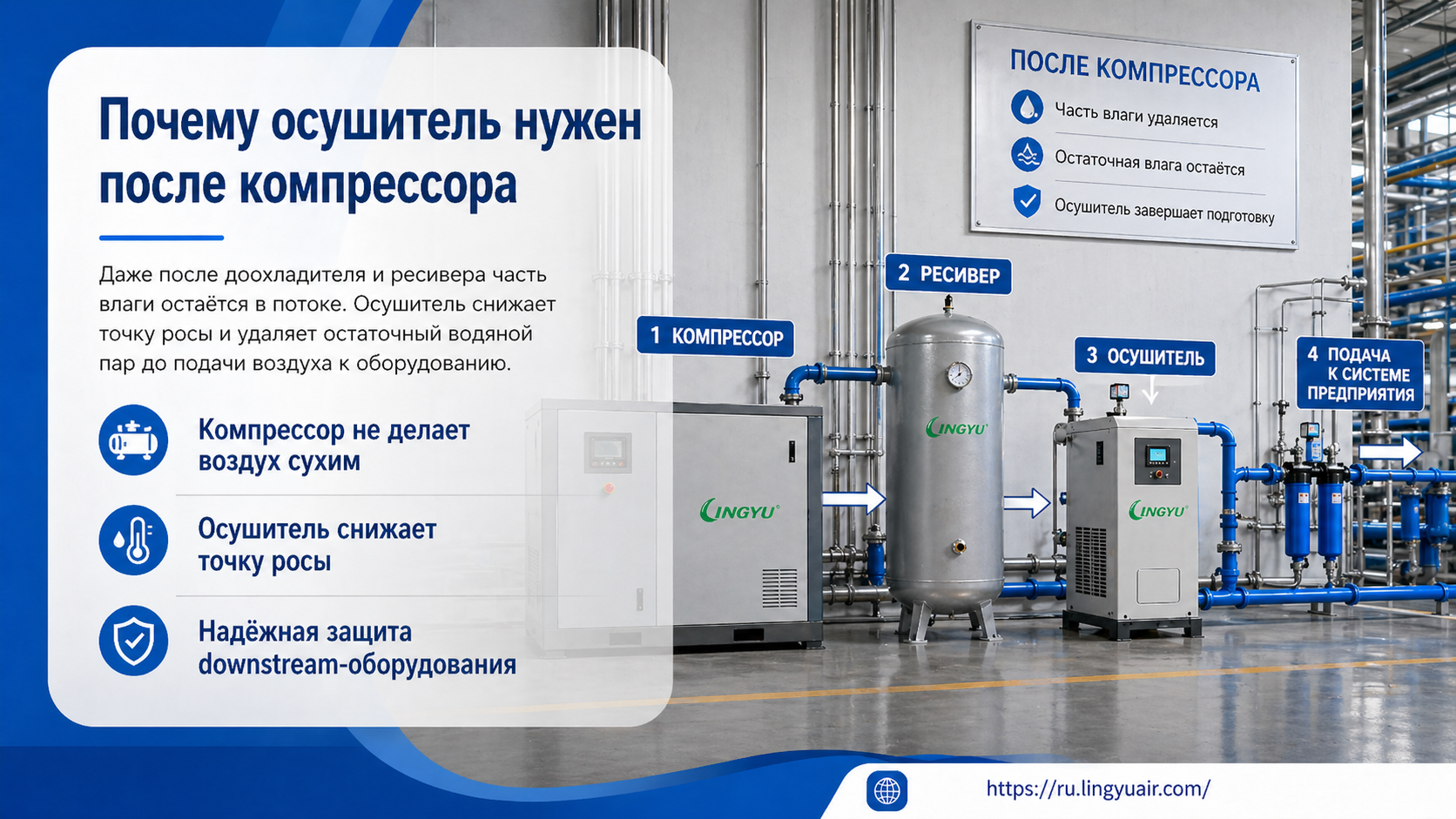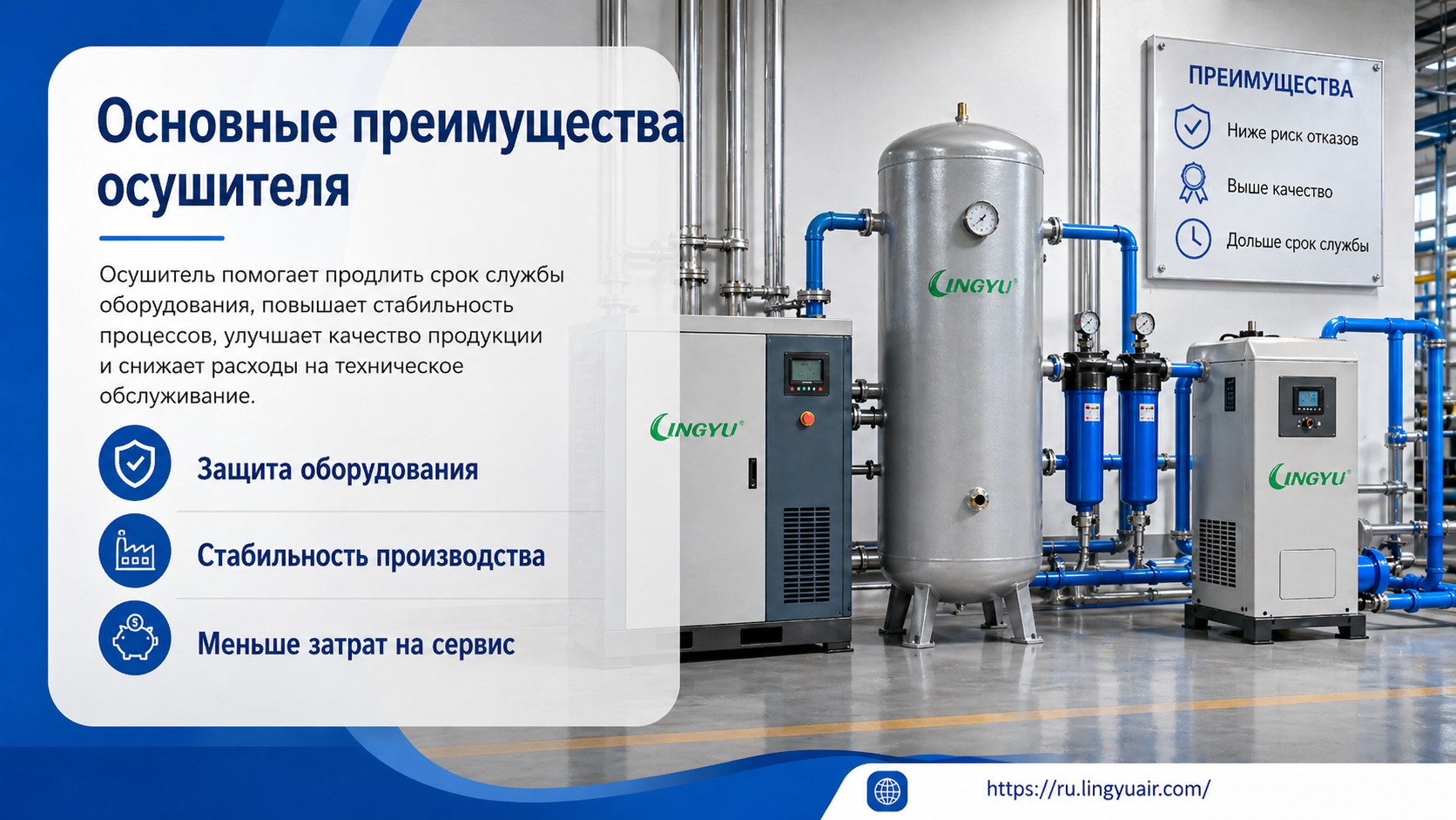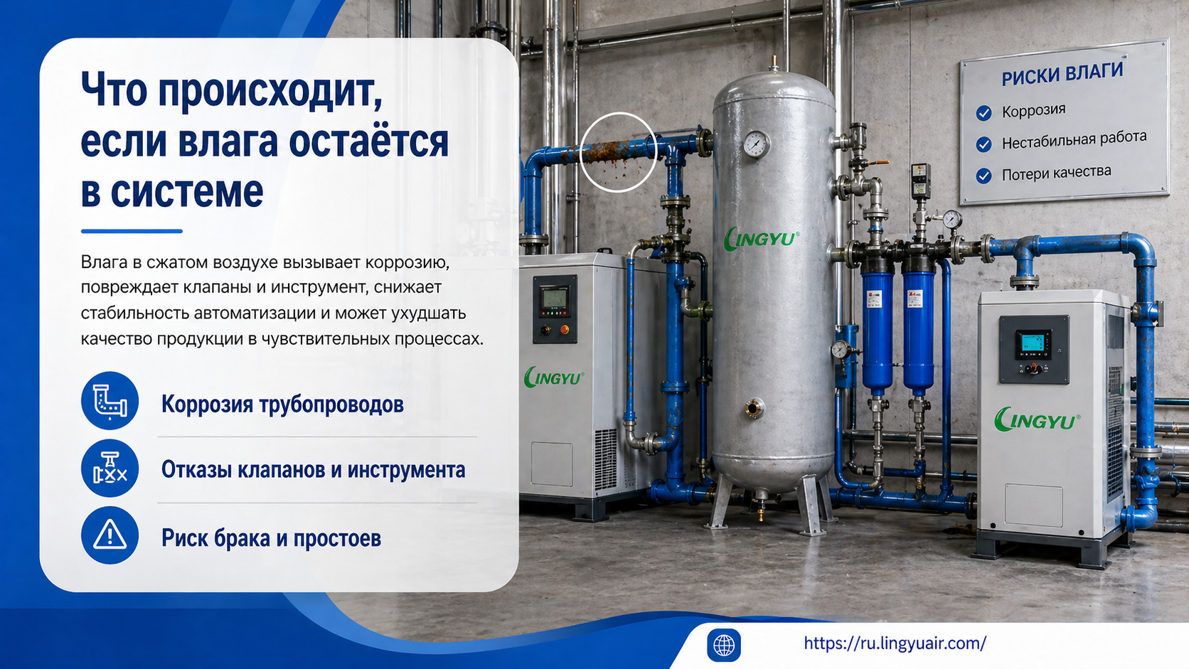 Для российских условий это особенно актуально ещё и потому, что многие предприятия работают при сезонных перепадах температуры, в крупных цехах с протяжёнными трубопроводами или в регионах с холодным климатом. В таких условиях риск конденсации и повторного появления влаги в сети возрастает ещё сильнее.
