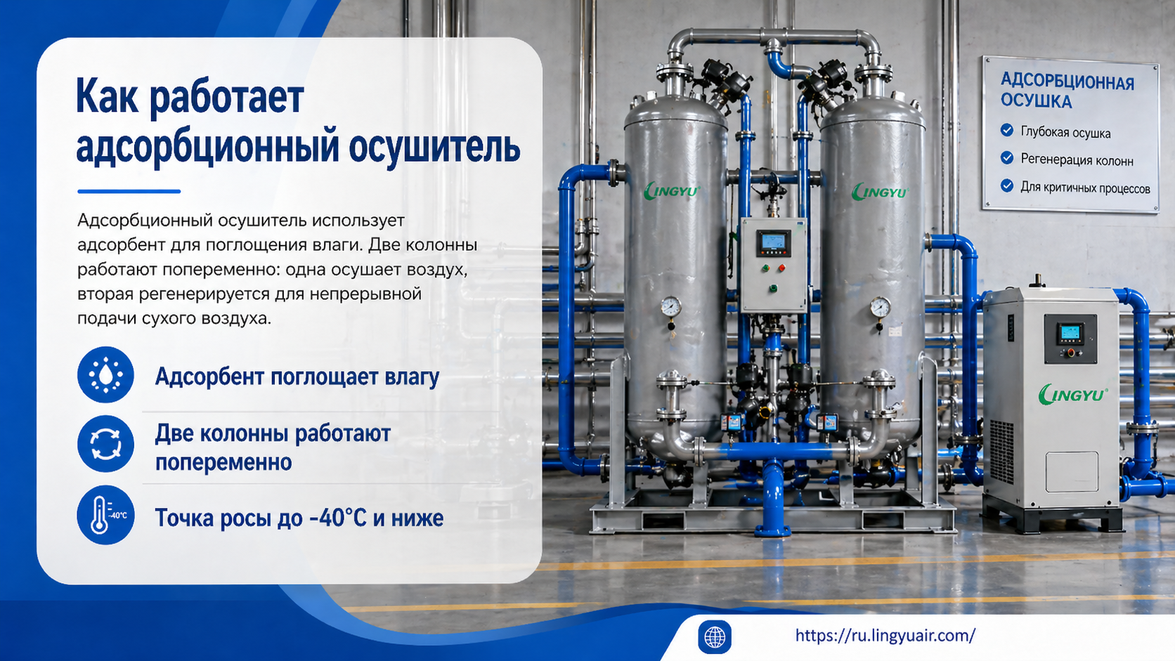 Адсорбционный осушитель удаляет влагу за счёт адсорбции. Сжатый воздух проходит через осушающий материал, например активированный оксид алюминия или молекулярное сито, который улавливает водяной пар. Такие осушители способны обеспечивать очень низкую точку росы под давлением, например -40°C и ниже.