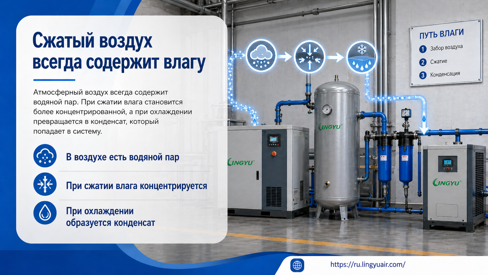 Атмосферный воздух никогда не бывает полностью сухим. В нём всегда присутствует определённое количество водяного пара, и его объём зависит от температуры, влажности и условий окружающей среды. Когда компрессор засасывает окружающий воздух, вместе с ним в систему поступает и эта влага.